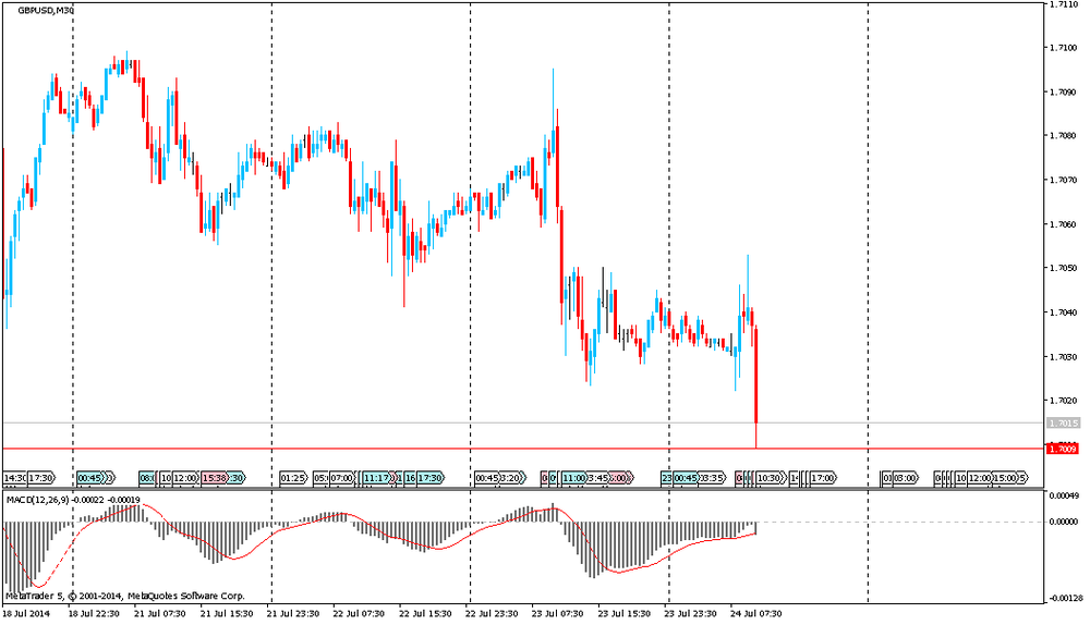 Фунт упал к $1.7009, обновив сессионный минимум после выхода негативных данных по объему розничных продаж в Великобритании. Опубликованный сегодня отчет показал снижение июньского показателя по отношению к этому же периоду в прошлом году до +3.6%, тогда как аналитики рассчитывали на то, что рост розничных продаж составит (как и в прошлом отчетном периоде) +3.9%. Таким образом, данные не оправдали оценок экспертов, указав на слабость экономики Великобритании.