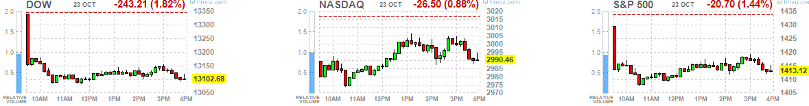 Акции Michelin & Cie (ML) прибавили 3,4% до 63,97 евро. Второй по величине в мире производитель шин заявил, что в третьем квартале выручка выросла на 5,7% до 5,44 миллиарда евро, превысив ожидания аналитиков на уровне 5,310 млрд евро.Основные фондовые индексы США немного восстановились от сессионных минимумов, но все же завершили торги существенным падением.