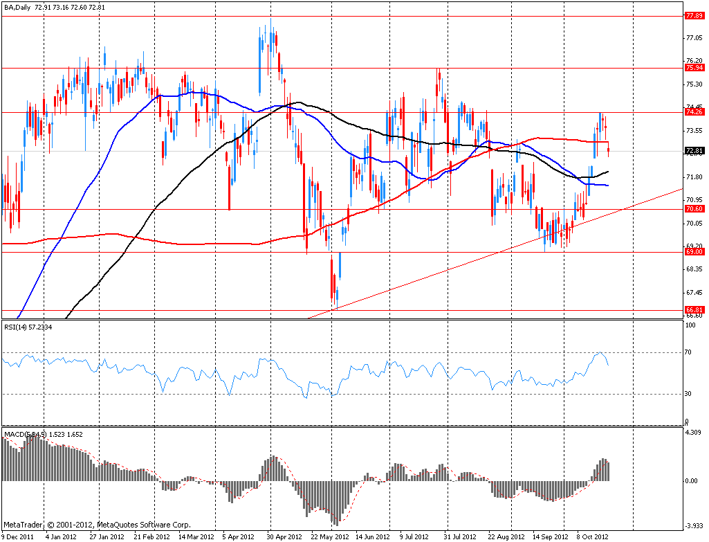 За октябрь акции BA выросли более чем на 4%. На премаркете акции компании обновили октябрьский максимум, который был установлен в области $74,30 (сейчас ближайшая поддержка). Ниже ($73.10/00) расположено МА(200) для D1.