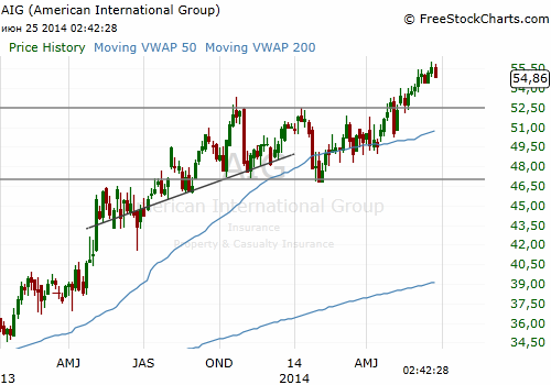 На фундаментальном уровне AIG сейчас далека от своих прошлых уровней. Оценка справедливой стоимости страховщика составляет почти $70 за акцию. Акции компании торгуются на уровне примерно $55, но имеют хороший потенциал роста. Совет директоров AIG, кажется, согласен с этой точкой зрения, и недавно санкционировал выкуп дополнительно акций на $2 млрд, что частично финансируется за счет завершения продажи подразделения ILFC. С конца первого квартала 2014 года, AIG выкупила акций более чем на $400 млн.