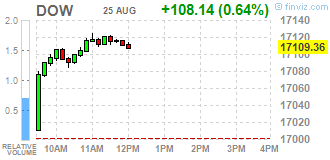 Большинство компонентов индекса DOW демонстрируют рост (29 из 30). Аутсайдером являются акции Wal-Mart Stores Inc. (WMT, -0.05%). Больше остальных выросли акции JPMorgan Chase & Co. (JPM, +2.24%).