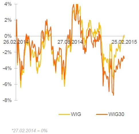 Индикатор наиболее ликвидных бумаг WIG30 прибавил 0.44%. Локомотивом роста индекса стали бумаги KGHM (KGH-WA). Акции данной компании подорожали на 2.89% на фоне роста мировых цен на медь - основную продукцию компании. Кроме того, существенную поддержку индексу оказали бумаги CCC (CCC-WA), котировки которой взлетели на 8.94% на оптимистичных оценках аналитиков. В тоже время, в лидерах падения среди наиболее ликвидных акций оказались бумаги EUROCASH (EUR-WA), подешевевшие на 9.92% на новостях о слабых финансовых результатах за четвертый квартал 2014 года.