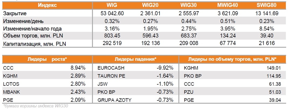 В четверг польский рынок акций, как и основные европейские площадки, показал положительную динамику. Индекс широкого рынка WIG вырос на 0.32%.