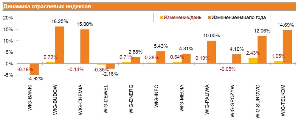 В отраслевом разрезе максимальные темпы роста котировок зафиксированы в сегменте сырьевых компаний и телекоммуникационном секторе - соответствующие индексы WIG-SUROWC и WIG-TELKOM выросли на 2.43% и 1.05%. Напротив, более всего потеряли девелоперские компании - индекс WIG-DEWEL снизился на 0.35% после роста на 2.01% днем ранее.
