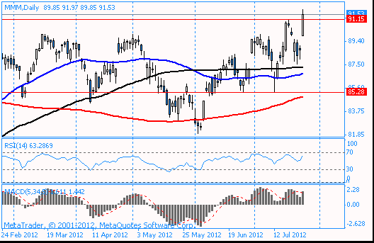 График: акции MMM отступили от максимумов 2012 года, которые были достигнуты на прошлой неделе и являются ближайшим сопротивлением для дневного графика.