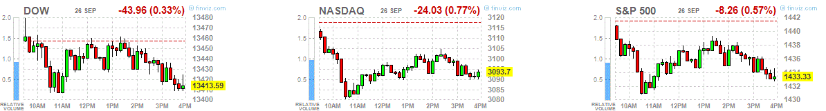Причиной данных опасений является Испания, где в ближайшие дни будет объявлено о проведении бюджетных, банковских и структурных реформ. Сегодня Банк Испании заявил, что в 3 квартале ВВП страны может значительно сократиться.На рынке нарастают негативные настроения. Индексы полностью перекрыли свой рост, который стал результатом оглашения решения Комитета по открытым рынкам ФРС о запуске нового раунда QE. Снижение рынков не сумели остановить опубликованные накануне американские данные, которые вышли лучше прогнозов (индекс цен на жилье, индекс уверенности потребителей).