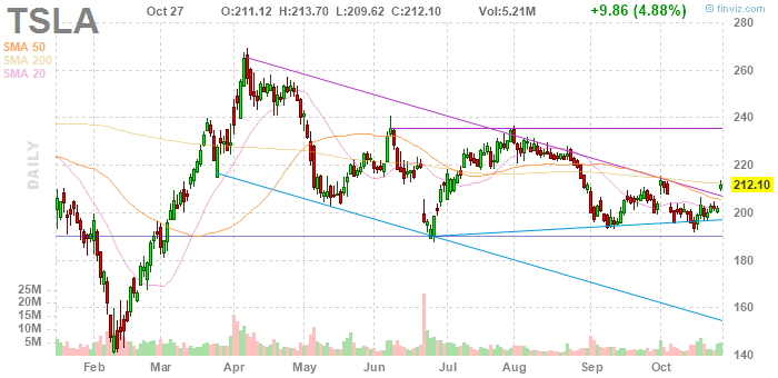 На текущий момент акции Tesla Motors (TSLA) котируются по $212,10 (+4,88%)