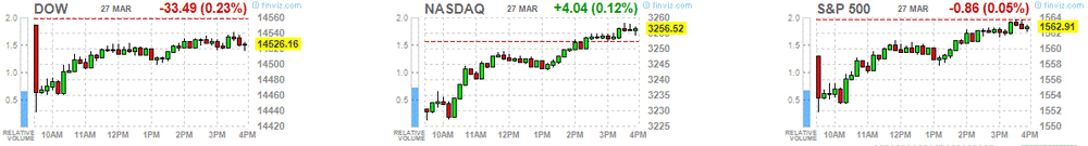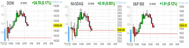 Индексы отступили от сессионных максимумов, но продолжают удерживаться на позитивной территории, завершая 1-й квартал существенным приростом. В связи с празднованием страстной пятницы завтра финансовые рынки США будут закрыты.