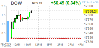 Компоненты индекса DOW торгуются преимущественно в плюсе (17 из 30). Аутсайдером являются акции Chevron Corporation (CVX, -5.72%). Больше остальных выросли акции Wal-Mart Stores Inc. (WMT, +3.15%).