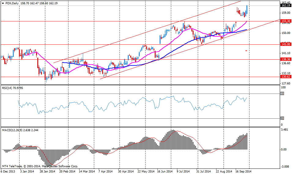 Большинство компонентов индекса DOW торгуются в плюсовой зоне (17 из 30). Аутсайдером являются акции Chevron Corporation (CVX, -1.16%). Больше остальных выросли акции Visa Inc. (V, +1.40%).
