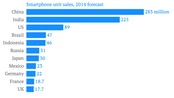 Китай является ключевым рынком для Apple. В своем последнем квартале около 16% из $37 млрд выручки пришли из Китая. Китай также является крупнейшим в мире рынком для смартфонов. Следующая диаграмма иллюстрирует прогноз продаж смартфонов в 2014 году по странам: