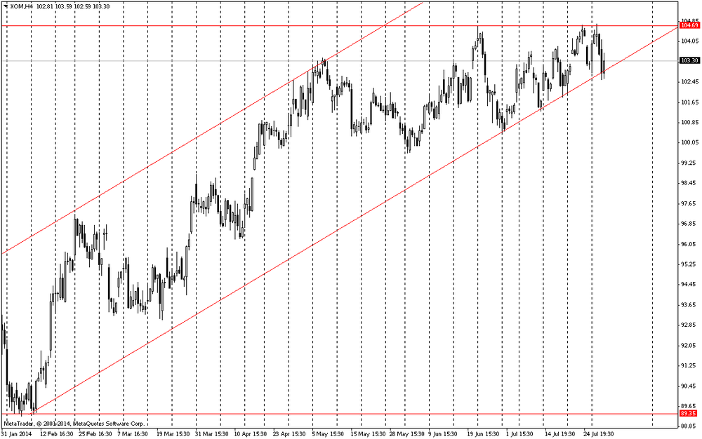 Все компоненты индекса DOW торгуются в минусе. Наибольшее снижение демонстрируют акции Exxon Mobil Corporation (XOM, -2.87%), квартальный отчет которой не впечатлил инвесторов.
