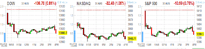 Dow 13,000.78 -106.70 -0.81%Nasdaq 3,048.71 -32.48 -1.05%