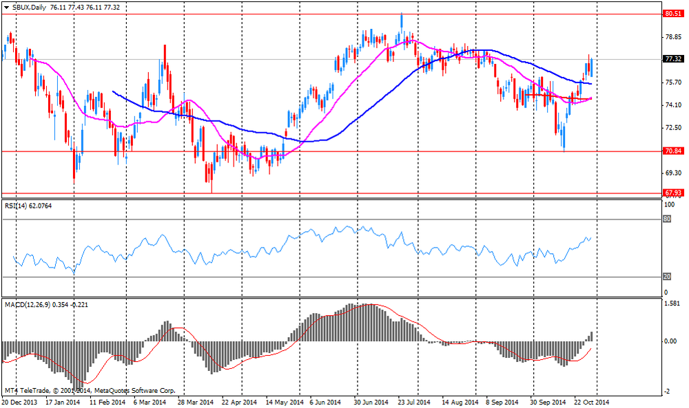 Котировки Royal Bank of Scotland Group Plc поднялись на 4,1%. Банк впервые за три года зафиксировал прибыль в 3-м квартале на уровне 896 млн фунтов по сравнению с чистым убытком в 828 млн фунтов годом ранее. Аналитики ожидали прибыль на уровне 582 млн. фунтов.
