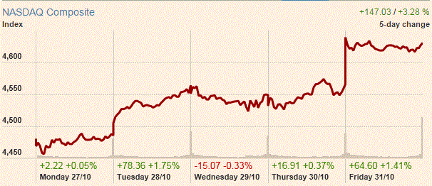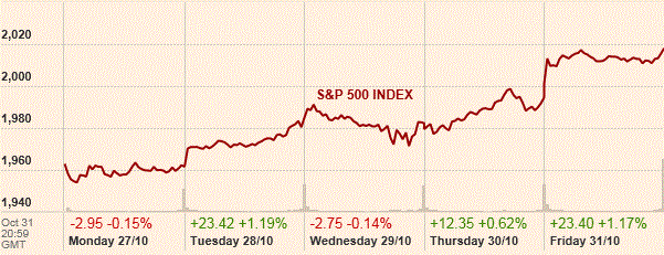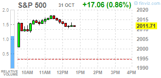 В четверг основные фондовые индексы США завершили торги в плюсе. Экономика США выросла больше прогноза в третьем квартале, подтвердив оптимизм, побудивший Федеральную резервную систему прекратить закачивать деньги в финансовые рынки. Как стало известно, экономика США заметно выросла в течение третьего квартала, превысив при этом прогнозы экспертов, несмотря на опасения по поводу состояния мировой экономики. Министерство торговли заявило, что валовой внутренний продукт - общий показатель товаров и услуг, произведенных в стране - вырос с учетом сезонных колебаний на 3,5% годовых в третьем квартале. Многие эксперты ожидали, что экономика расширится только на 3,1%. Рост последовал за неровной первой половиной года: во 2-м квартале ВВП повысился на 4,6% годовых после падения на 2,1% в 1-м квартале. Кроме того, количество новых обращений за пособием по безработице неожиданно увеличилось на прошлой неделе, но осталось вблизи исторического минимума, указывая на стабильную ситуацию на рынке труда. По данным департамента труда, с учетом сезонных колебаний число первичных заявок на пособие по безработице выросло за неделю, завершившуюся 25 октября, на 3 000 - до уровня 287 000. Экономисты прогнозировали, что число обращений составит 277 тыс. Между тем, показатель за предыдущую неделю был пересмотрен до 284 тыс. с 283 тыс.