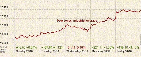 В последнюю сессию недели фондовые рынки США продемонстрировали положительную динамику. Как показали последние данные, индекс менеджеров по закупкам Чикаго существенно улучшился в октябре. С учетом сезонной коррекции индекс вырос до 66,2 против 60,5 в сентябре. Согласно средним прогнозам экспертов, значение данного показателя должно было уменьшится до 59,5 пункта. Кроме того, как показали окончательные результаты исследований, представленные Thomson-Reuters и Мичиганским институтом, в октябре американские потребители чувствуют себя более оптимистично в отношении экономики, чем было зафиксировано в прошлом месяце. Согласно данным, в октябре окончательный индекс потребительских настроений вырос до уровня 86,9 по сравнению с окончательным чтением за сентябрь на уровне 84,6 и первоначальной оценкой за октябрь на отметке 86,4. Стоит отметить, что, согласно средним оценкам экспертов, данный индекс должен был вырасти по сравнению с сентябрьским значением до отметки 86,4.