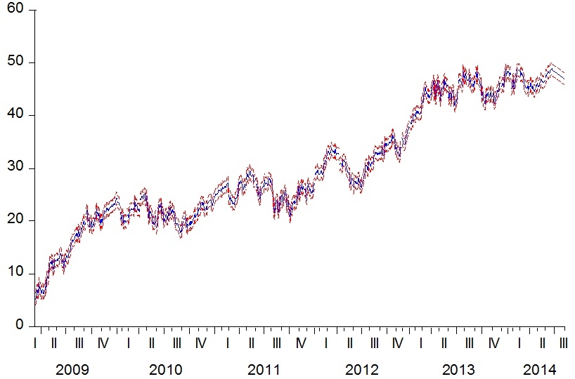 Рис. 5 Прогноз динамики цен акций International Paper Company (собственный расчет)
