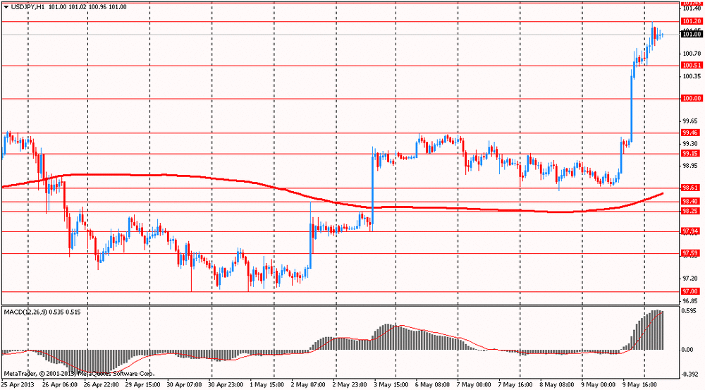 Иена продолжила свое падение перевалив за уровень Y101 за доллар впервые за четыре года, после выхода оказавшихся лучше прогноза данных по числу заявок по безработице в США. Публикация этого отчета спровоцировала широкомасштабный рост доллара. Иена упала на 15% в этом году. Число первичных заявок на пособие по безработице в США на неделе 28 апреля - 4 мая снизилось на 4000 и с учетом коррекции на сезонные колебания составило 323 000. Об этом свидетельствуют данные Министерства труда, представленные в четверг. Такое значение оказалось лучше прогноза экономистов. Паре USD/JPY наконец удалось пробить отметку Y100. Она торговалась в районе этого уровня с 4 апреля, когда Банк Японии представил агрессивный план по вливанию ликвидности в свою экономику для стимулирования роста ВВП.