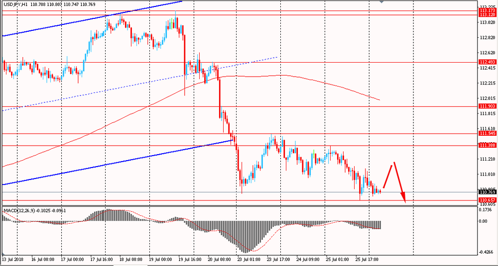 Сегодня утром пара USD/JPY снизилась к Y110.70, продолжая вчерашнее снижение. В среду пара также падала, обновила недельные минимумы и закрыла день на отрицательной территории. На данный момент USD/JPY все еще находится ниже MA 200 H1 и с 19 июля торгуется под полным контролем медведей. В данной ситуации, наиболее логичным будет искать новые. позиции на продажу, придерживаясь общего направления тенденции.