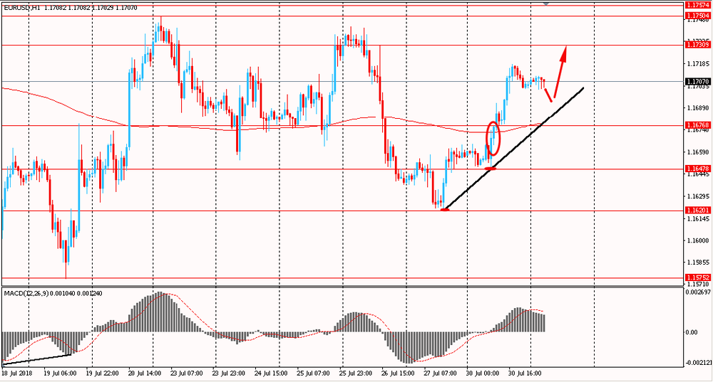 Пара EUR/USD сегодня утром торговалась в диапазоне $1.1700-10, оставаясь около вчерашних максимумов. В понедельник пара резко выросла и закрыла день на положительной территории. На данный момент единая валюта смогла пробить и закрепиться выше линии скользящей средней MA 200 H1. Пока пара будет удерживаться выше данного мувинга и выше линии поддержки от 27 июля, логичным будет присматриваться к покупкам евро на коррекциях.