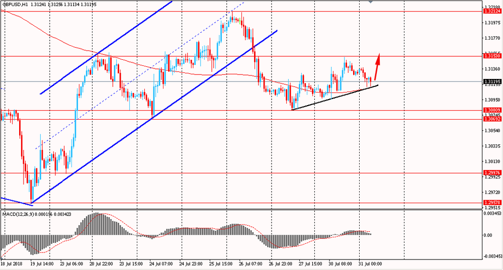 Пара GBP/USD сегодня утром немного снизилась к $1.3110. В понедельник, как и в пятницу, пара торговалась в узком диапазоне, без существенных изменений, и закрыла день около цены открытия. Фунт находится в коррекции после резкого снижения 26 июля. На данный момент пара тестирует на прочность линию скользящей средней MA 200 H1. Пока пара находится в данной консолидации можно присматриваться к покупкам пары, но с короткими целями. Однако, если британская валюта пробьет линию поддержки последних 2-х торговых дней от 27 июля, необходимо будет открывать продажи.