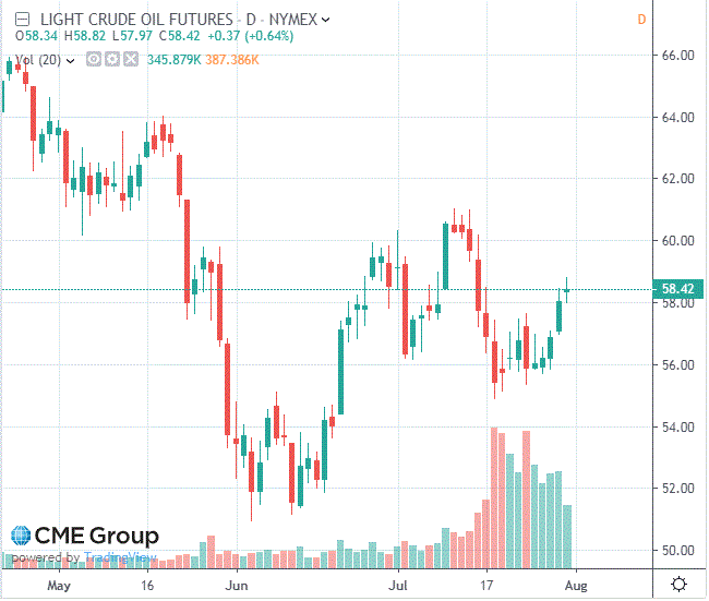 Минэнерго США сообщило, что на прошлой неделе запасы нефти в США резко упали, и достигли самой низкой отметки с ноября 2018 года. Согласно отчету, на неделе 20-26 июля запасы нефти упали на 8,5 млн баррелей, до 436,5 млн баррелей, и теперь точно соответствуют среднему 5-летнему значению для этого времени года. Аналитики ожидали снижения запасов нефти на 2,588 млн баррелей. Запасы нефти в терминале Кушинга упали на 1,5 млн баррелей, до 48,9 млн баррелей. Запасы бензина снизились на 1,8 млн баррелей, до 230,7 млн баррелей, что совпало с прогнозом аналитиков. Запасы дистиллятов снизились на 894 000 баррелей, до 135,9 млн баррелей. Аналитики ожидали увеличение запасов на 700 000 баррелей. Загруженность нефтеперерабатывающих мощностей упала на 0,1%, до 93,0%, тогда как аналитики ожидали роста на 0,8%. Между тем, добыча нефти подскочила до 12,200 млн баррелей в день против 11,300 млн баррелей в день неделей ранее. "Сильное падение запасов нефти произошло несмотря на восстановление добычи после урагана "Барри" и снижение загруженности НПЗ приблизительно на 500 000 против уровней годовой давности", – сообщил Мэтт Смит из ClipperData.