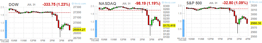 Основные фондовые индексы США значительно снизились, катализатором чему были итоги заседания ФРС и заявления главы ФРС Пауэлла, который дал понять, что понижение ставки - не начало длинного цикла смягчения, а корректировка в середине цикла,