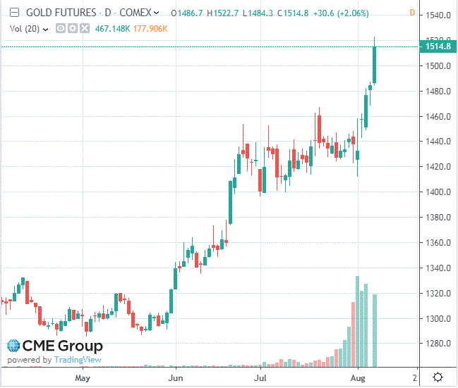 Цены на золото выросли более чем на 2% в среду, впервые за шесть лет превысив отметку $1500, поскольку инвесторы устремились в безопасные активы, напуганные множеством неопределенностей, включая торговлю между США и Китаем и замедление мировой экономики.
