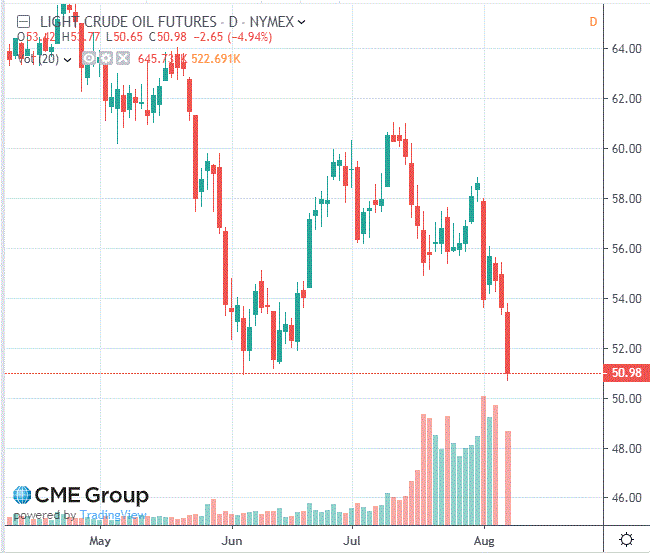 Нефть Brent подешевела более чем на 12% после того, как на прошлой неделе президент США Дональд Трамп заявил, что с 1 сентября он введет 10%-ный тариф на еще $300 млрд китайского импорта, отправив глобальные рынки акций в штопор.