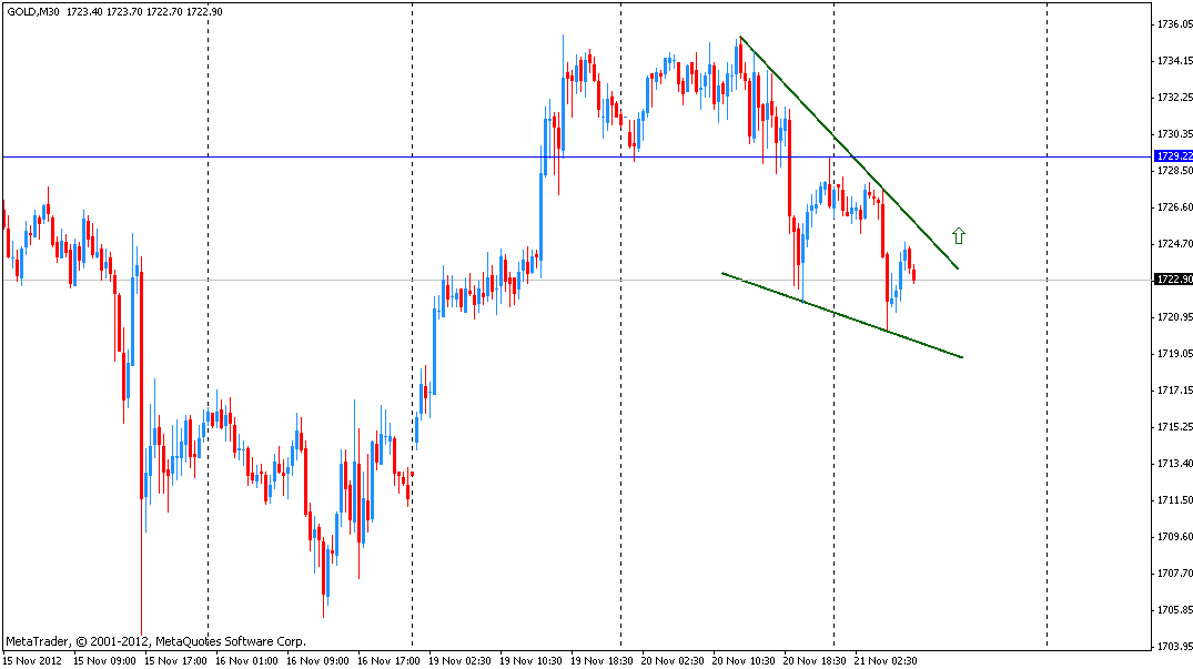 На получасовом графике GOLD формирует фигуру “нисходящий клин”: