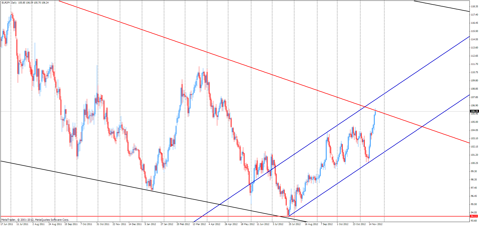 На графике D1 видно, что в ходе существенно роста, который начался с 13 ноября пара достигла сильной линии сопротивления, которая построена по максимальным значениям 26 октября 2009 года и 11 апреля 2011 года. В связи с этим стоит отметить, что пара может в среднесрочной перспективе изменить направление тренда, а целью данного снижения первоначально будет выступать линия поддержки канала. Но если данная линия не сможет оказать должной поддержки курс валюты может упасть вплоть до уровня Y94.15, который является минимумом 24 июля этого года.