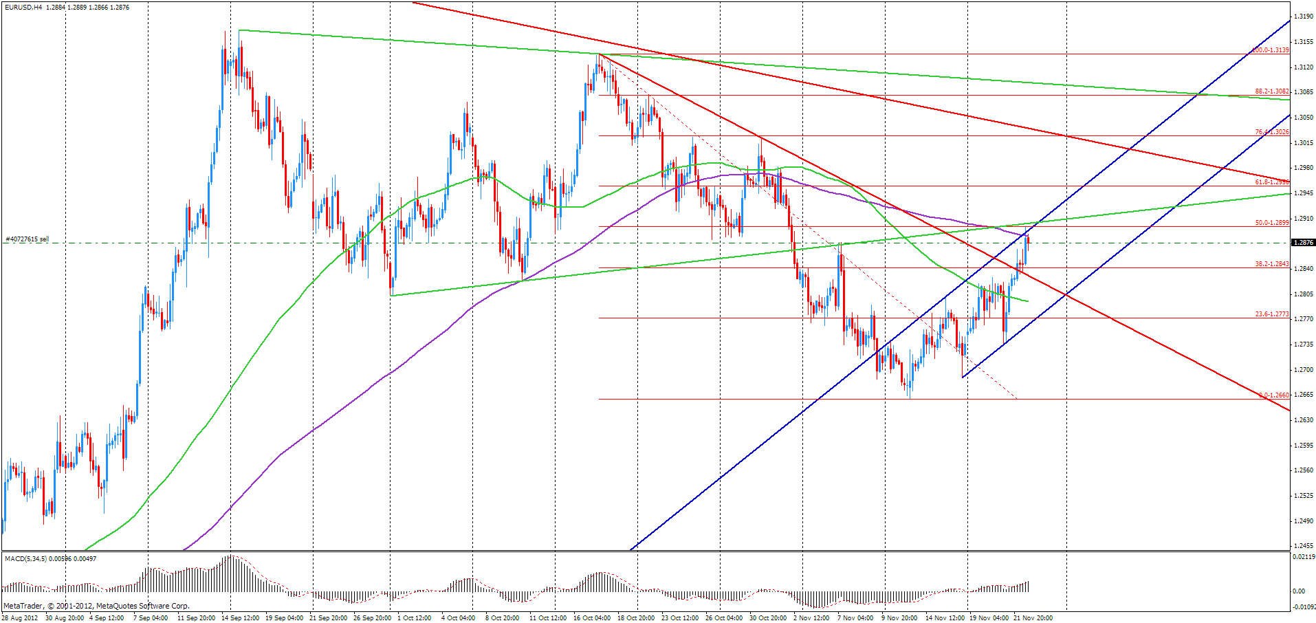 Анализ графика Н4 выявил, что в ходе сегодняшнего восходящего движения пара коснулась линии сопротивления канала. Также в данном районе находится уровень 50% по FIBO ($1.2660-$1.3140) и линия МА(200) для Н4. Отметим также, что рост пары сейчас может сдерживать линия сопротивления треугольника, до которой ранее курс уже восстанавливался после пробития фигуры. Если пара все таки изменит направление своего движения, то целью для падения будет линия поддержки, построенная от 14 и 31 октября.