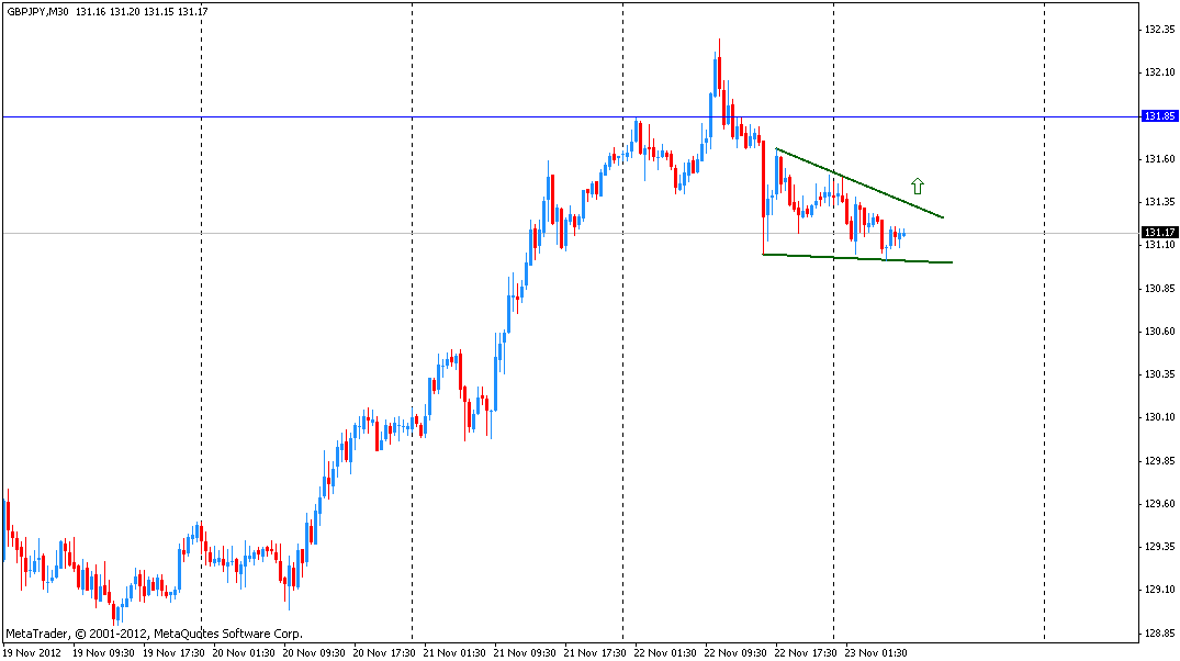 Actualmente el par se acercó al nivel de resistencia de la fugura. Si el par logra consolidarse por encima del nivel de resistencia,es posible un movimiento nuevo hacia arriba al nivel Y131.85 (máximo de sesión asiática de nov. 22). Cabe señalar que en el gráfico H1 se observa una tendencia alcista reforzando la señal de la figura.