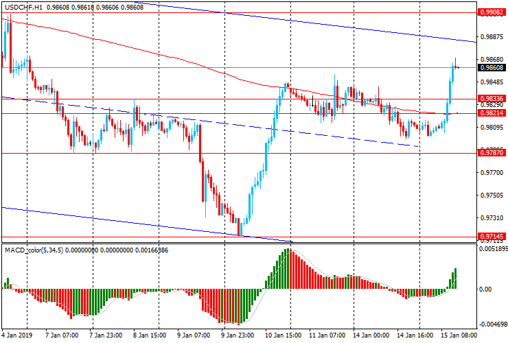 Пара USD/CHF резко выросла, достигнув максимального значения с 7 января (Chf0.9870). Пара также прорвала уровень скользящей средней МА (200) Н1, но все еще продолжает торговаться ниже уровня скользящей средней МА (200) Н4. USD/CHF глобально продолжает торговаться в рамках нисходящего канала от 17 декабря. Таким образом, на данный момент она остается под контролем медведей и есть смысл и далее искать точки входа на продажу при формирование коррекций.