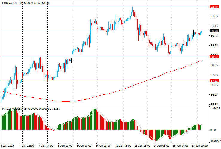 Вчера нефть выросла после снижения в понедельник до $58.90. Сегодня утром нефть торгуется немного выше вчерашнего максимума. Таким образом черное золото продолжает торговаться в рамках общего восходящего тренда от 26 декабря и находится выше линии скользящей средней MA 200 H1. Нефть торгуется под контролем быков в аптренде. В связи с этим логичным будет искать точки входа на покупку.