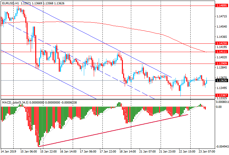 Пара EUR/USD торгуется в узком диапазоне после достижения вчера более чем двухнедельного минимума $1.1335. Пара продолжает торговаться в рамках нового нисходящего канала от 10 января. EUR/USD также закрепилась ниже уровня скользящей средней МА (200) Н1 и опустилась ниже МА (200) Н4. Пока пара будет находится в рамках данного тренда, есть смысл придерживаться южного направления в торговле и на окончание коррекции открывать новые продажи.