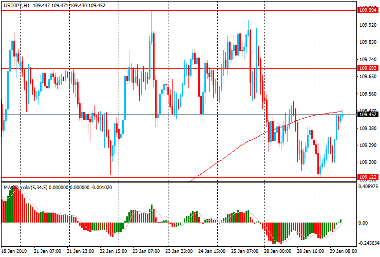 Пара USD/JPY торгуется с незначительным ростом после снижения с начала торгов до Y109.10. Сейчас пара торгуется около Y109.45. USD/JPY сегодня тестирует уровень скользящей средней MA 200 H1. Но, отметим, что на четырехчасовом графике пара торгуется значительно ниже МА (200) Н4. Пока USD/JPY остается под контролем медведей и есть смысл и далее искать точки входа на продажу.