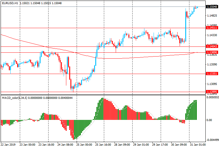 Пара EUR/USD вчера резко выросла, достигнув максимального значения с 15 января $1.1500. Сегодня пара торгуется в узком диапазоне около вчерашнего максимума. Единая валюта также закрепилась выше линии скользящей средней MA 200 H1 и МА (200) Н4. Таким образом можно заявить, что пара перешла под контроль быков. Пока EUR/USD будет находится в рамках данного тренда, есть смысл придерживаться северного направления в торговле и коррекции открывать новые покупки.