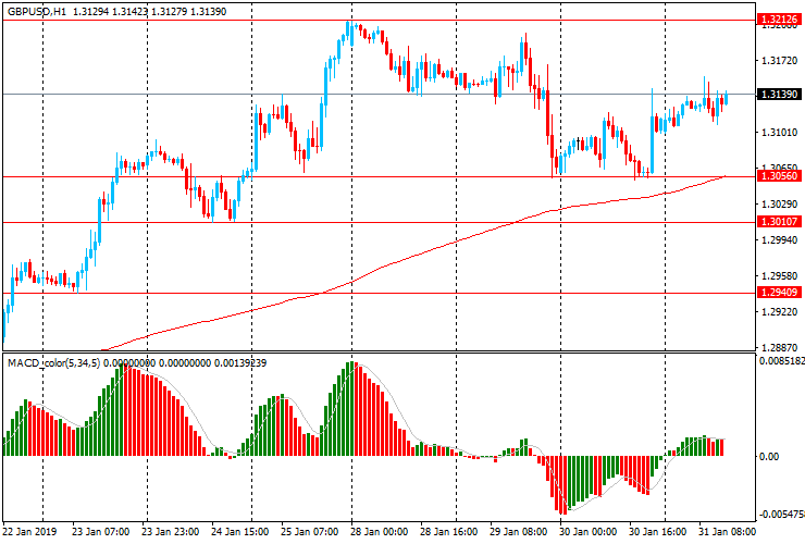 Пара GBP/USD продолжает восстанавливаться, после снижения во вторник к $1.3055 (минимум 25 и 29-30 января). Сегодня пара торгуется около $1.3135. GBP/USD торгуется выше линии скользящей средней MA 200 H1 и глобально остается в рамках общего восходящего канала от 12 декабря. В этой ситуации лучше и далее придерживаться северного направления в торговле и на формирование коррекции искать точки входа на покупку.