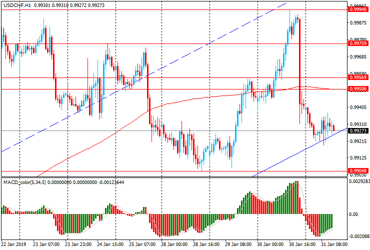 Основной сценарий продвижения пары - прорыв сопротивления Chf0.9950-55 (максимум 29 января, МА (200) Н1) и рост к Chf0.9995 (максимум 30 января).