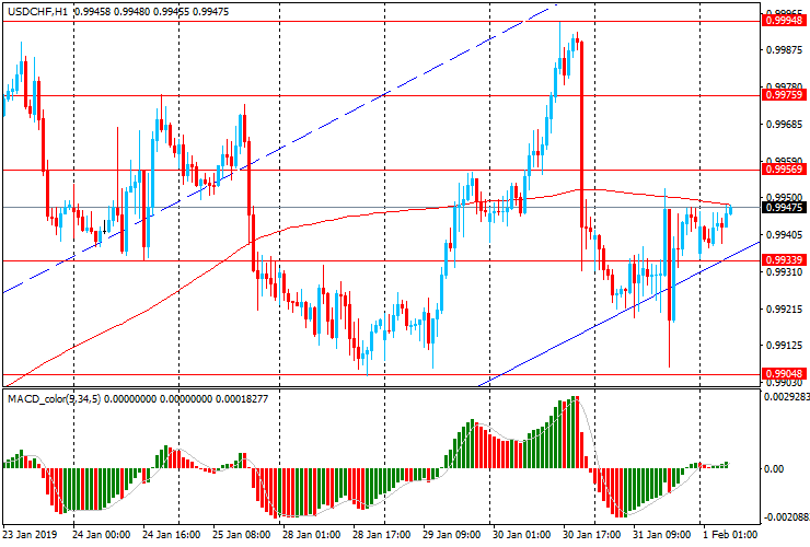 Пара USD/CHF восстановилась после снижения вчера до минимума 28 января Chf0.9905. Сегодня пара продолжает расти и торгуется около Chf0.9945. Пара тестирует уровень скользящей средней MA 200 H1, но остается выше МА (200) Н4. Таким образом USD/CHF все еще остается в рамках восходящего канала от 10 января. В этой ситуации лучше и далее придерживаться северного направления в торговле и на образование коррекции искать точки входа на покупку.