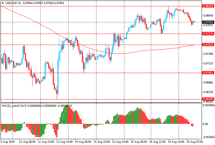 Основной сценарий продвижения пары - прорыв области Chf0.9755-70 (минимум 19 августа, МА (200) Н1) и снижение к Chf0.9705 (минимум 14 августа)