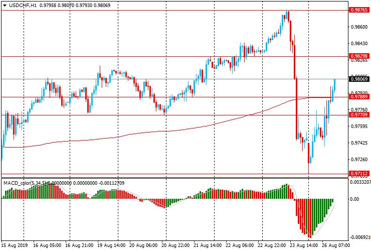 Пара USD/CHF торгуется с ростова после резкого снижения в пятницу и с начал сегодняшних торгов с Chf0.9875 (максимума американской сессии 2 августа и максимум 23 августа) до Chf0.9710 (минимум 14 августа). Сегодня пара выросла к Chf0.9805. USD/CHF поднялась немного выше уровня скользящей средней МА (200) Н1 (Chf0.9790), но на четырехчасовом графике торгуется немного ниже МА (200) Н4 (Chf0.9820). Пара пытается определиться с направлением.