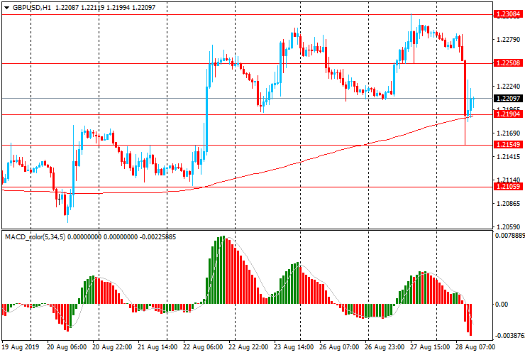 Основной сценарий продвижения пары — прорыв сессионного минимума $1.2155 и МА (200) Н1 ($1.2190) и снижение к $1.2105 (минимум 22 августа)