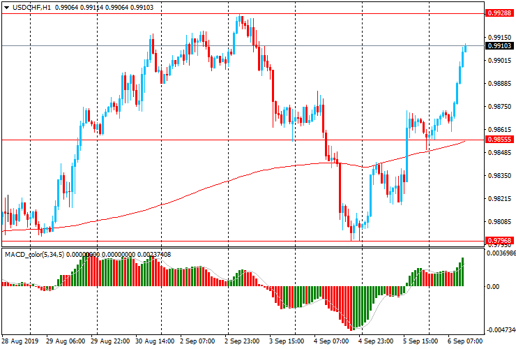 Пара USD/CHF торгуется с ростом вторую сессию подряд и выросла до Chf0.9910, отступив от недельного минимума Chf0.9795. USD/CHF поднялась выше уровня скользящей средней МА (200) Н1 (Chf0.9855), и на четырехчасовом графике торгуется немного выше МА (200) Н4 (Chf0.9820). Пара пытается определиться с направлением.