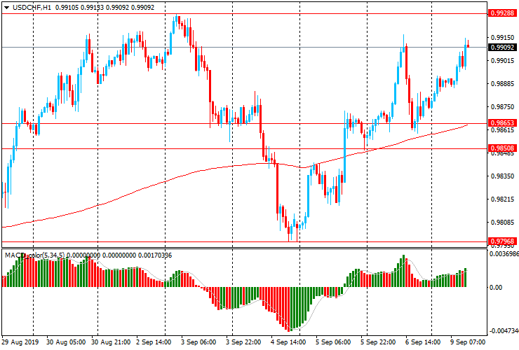 Пара USD/CHF торгуется с ростом, вновь достигнув максимума пятницы Chf0.9910. USD/CHF поднялась выше уровня скользящей средней МА (200) Н1 (Chf0.9865), и на четырехчасовом графике торгуется немного выше МА (200) Н4 (Chf0.9825), указывая на переход пары под контроль быков.