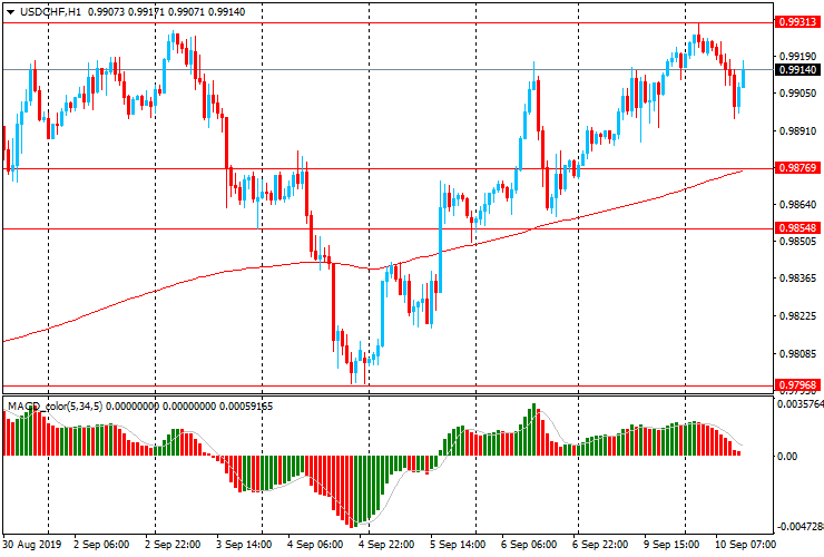 Пара USD/CHF торгуется со снижением после роста вчера и с начала сегодняшних торгов к максимуму 3 сентября Chf0.9930. К середине европейской сессии пара опустилась к Chf0.9895. USD/CHF остается выше уровня скользящей средней МА (200) Н1 (Chf0.9875), и на четырехчасовом графике торгуется немного выше МА (200) Н4 (Chf0.9825), указывая на переход пары под контроль быков.