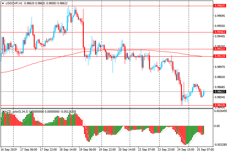 Пара USD/CHF торгуется в диапазоне Chf0.9850-75 после снижения вчера к трехнедельному минимуму Chf0.9845. USD/CHF опустилась ниже уровня скользящей средней МА (200) Н1 (Chf0.9910), и на четырехчасовом графике тестирует МА (200) Н4 (Chf0.9850). В этой ситуации стоит начать придерживаться южного направления и искать точки выхода на продажу.