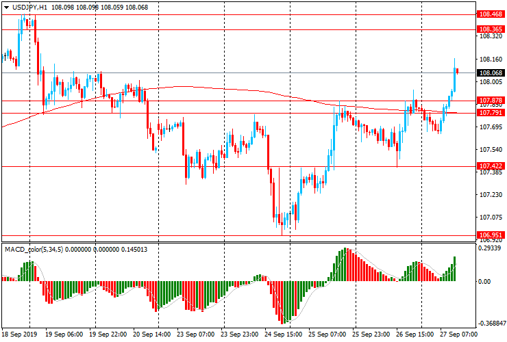 Пара USD/JPY торгуется с ростом, достигнув максимума 20 сентября Y108.15. USD/JPY поднялась выше уровня скользящей средней МА (200) Н1 (Y107.90), и продолжает торговаться значительно выше МА (200) Н4 (Y106.95), оставаясь под контролем быков. В этой ситуации стоит продолжать придерживаться северного направления в торговле и искать точки входа на покупку.