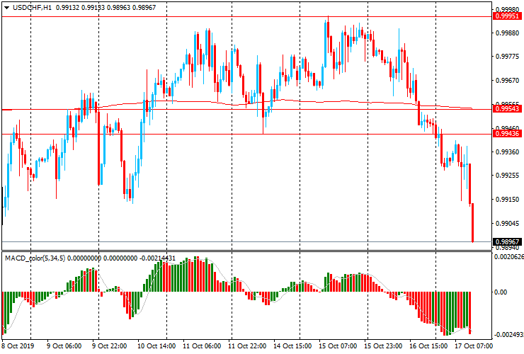 Пара USD/CHF торгуется со снижением, достигнув минимума 27 сентября и психологического уровня Chf0.9900, после роста на этой неделе к уровню Chf0.9995 (максимум 15 октября). USD/CHF опустилась ниже уровня скользящей средней МА (200) Н1 (Chf0.9955), и на четырехчасовом графике ниже МА (200) Н4 (Chf0.9925). В этой ситуации стоит начать придерживаться южного направления и искать точки выхода на продажу.